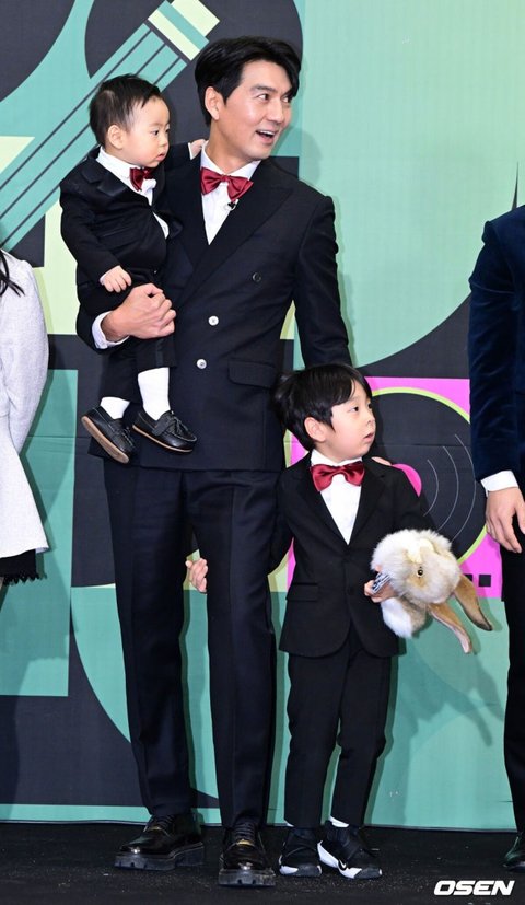 [OSEN=지형준 기자] 23일 오후 서울 여의도 KBS 신관 웨딩홀에서 2023 KBS 연예대상 레드카펫 포토월 행사가 열렸다.'슈퍼맨이 돌아왔다' 이필모가 담호, 도호와 포토타임을 하고 있다. 2023.12.23 / jpnews.osen.co.kr