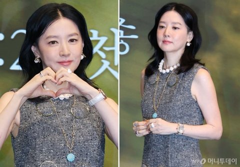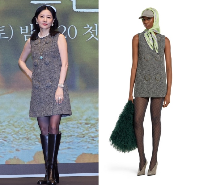 배우 이영애가 16일 서울 구로구 더세인트에서 열린 KBS2 새 토일 미니시리즈 '은수 좋은 날' 제작발표회에 참석했따. /사진=뉴스1, 구찌이영애가 착용한 의상은 '구찌' 제품이다. 가격은 500만원. 부츠도 같은 브랜드의 350만원 제품이다. 구찌 모델이 패턴 스타킹과 스카프로 복고 스타일링을 연출한 것과 달리 이영애는 부츠와 화이트 악어가죽 스트랩의 시계를 매치해 차분하고 우아한 분위기를 더했다.이영애는 '브레게'의 4만9200달러(한화 약 6789만원) 초호화 시계를 두른 것과는 달리 10만원~30만원대의 '파나쉬' 패션 주얼리를 선택해 감각적인 스타일링을 선보였다.