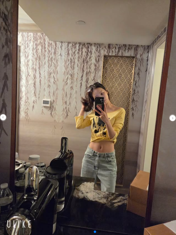 김채원은 또 장난기 넘치는 표정부터 은근히 섹시한 포즈까지 다양한 매력을 선보였다. 다른 사진에서는 거울 앞에서 자세를 취하고 있는데, 티셔츠를 살짝 올려 배와 복근을 드러내 날씬한 허리선을 돋보이게 했다.