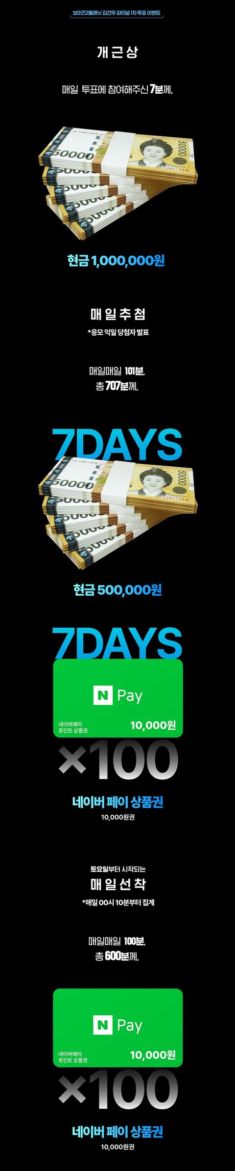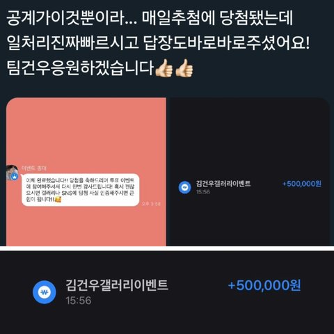 다른 곳 말고 김건우네 이벤트가 좋은 점✊️✊️ 1. 현물 아니고 시원하게 현금 박치기 해줌❤️ 2. 매일 선착순 100명에게 10000원씩 지급이라 운이 아닌 실력으로 가져갈 수 있음❤️❤️ 심지어 선착순 됐어도 추첨도 자동으로 중복응모됨!!! 3. 검수스탭 제일 많아서 응답도 빠를 예정❤️❤️❤️