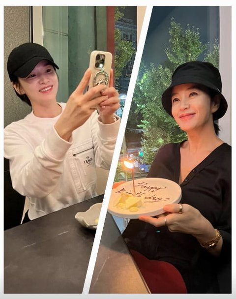 공개된 사진 속에는 송혜교가 화장기 적은 얼굴에 검은색 캡 모자를 착용한 채 카메라를 들고 있는 모습. 맞은편 김혜수 역시 같은 색깔의 버킷햇을 착용한 채 'Happy Birthday'라고 적혀있는 접시를 들고 있다. 특히 두 사람은 수수한 비주얼에도 박빙의 아름다운 미모를 보여주고 있어 눈길을 끌었다.