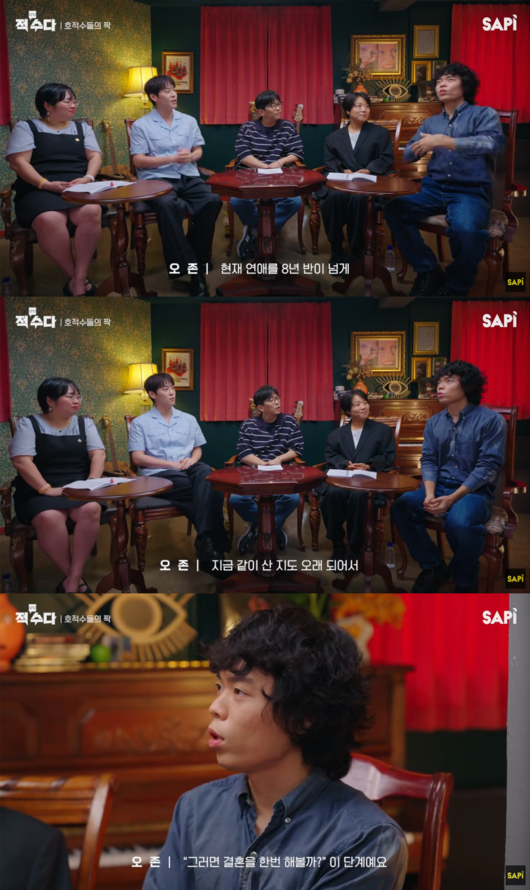 이를 듣던 존박은 “우리가 들었을 때 스펙 같은 게 있냐”고 물었고, 오존은 “현재 연애를 8년 반 넘게 무사고 연애 중이다”라고 했고, 이적은 “8년 이상 만났으면 결혼은 안했지만, 거의 결혼한 사람들만큼 서로 잘 알겠다”고 물었다.