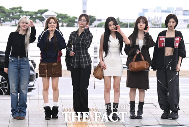 그룹 엔믹스(NMIXX) 베이, 지우, 설윤, 규진, 해원, 릴리(왼쪽부터)가 오는 20일 마카오 아웃도어 퍼포먼스 베뉴(Macao Outdoor Performance Venue, 澳門戶外表演區)에서 개최되는 ‘2025 더팩트 뮤직 어워즈(TMA)’ 참석을 위해 19일 인천국제공항을 통해 출국하며 포즈를 취하고 있다. /인천국제공항=이새롬 기자
