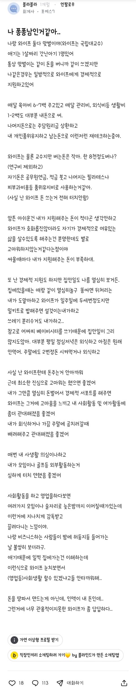 맞벌이하면서 살림 육아까지 와이프가 더 하는데도 본인이 퐁퐁이라고 착각하는 블라남