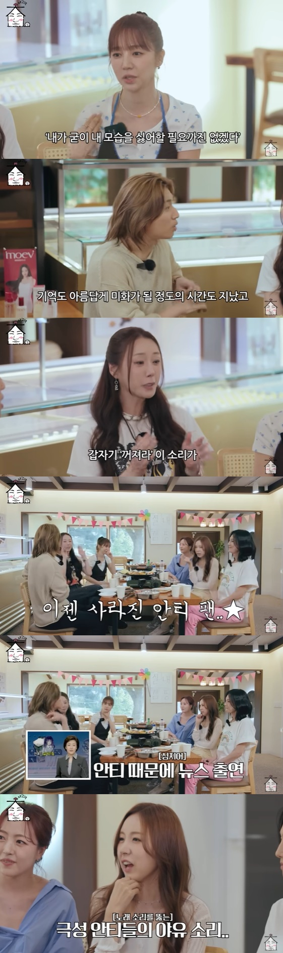 이에 김이지는 "무엇보다 욕하는 사람이 없다"며 "저희한테 '꺼져라'라고 하는 사람이 없어서 마음이 편안하다"라고 고백했다. 심은진은 "저희가 그 당시에 안티의 아이콘이었다"라며 한숨을 내쉬었다.