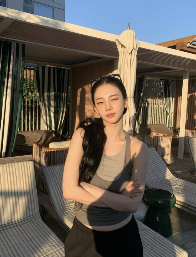 공개된 사진 속 카리나는 수영장 앞에서 머리를 하나로 묶고, 선글라스를 머리 위에 얹은 채 강한 햇살을 받으며 얼굴을 꾸기고 있다. 하지만 일그러진 표정마저도 굴욕 없는 미모로 눈길을 끌었다.