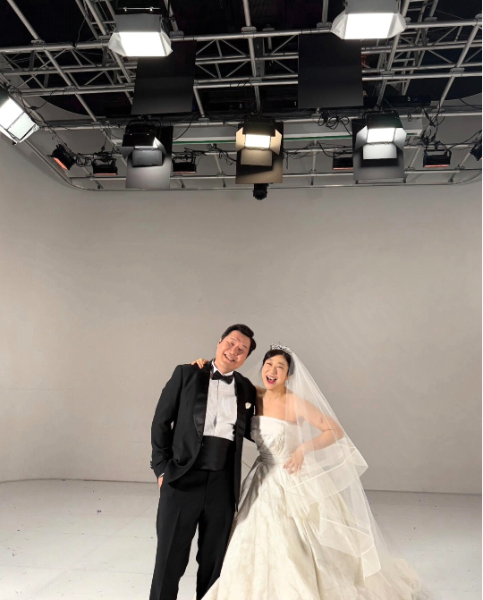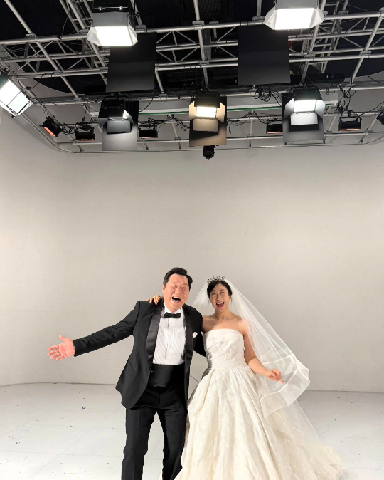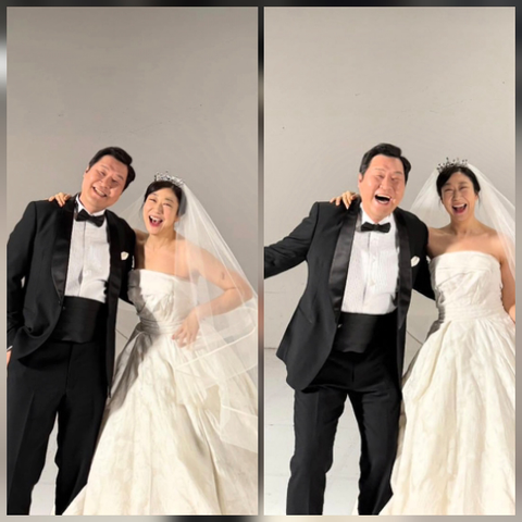 원숄더 스타일의 드레스와 화려한 티아라, 길게 늘어진 베일까지 더해져 실제 결혼식장을 방불케 했다. 윤경호 역시 턱시도를 입고 라미란과 포즈를 맞추며 즐거운 분위기를 연출했다.