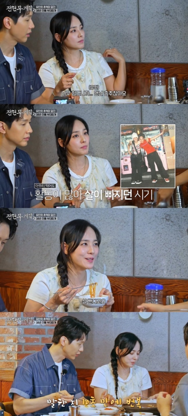유진은 “그때는 막 먹어도 살 안 찔 때다. 그때는 너무 힘드니까. 맨날 춤추지 않나. 맨날 바지를 줄였다. 새벽에도 먹고, 밤에도 먹었다”라며 “내가 지금 밥을 못 먹는 게 한이다. 살을 빼느라 칼국수라도 먹으려고 밥을 안 먹고 있다”라고 말했다.