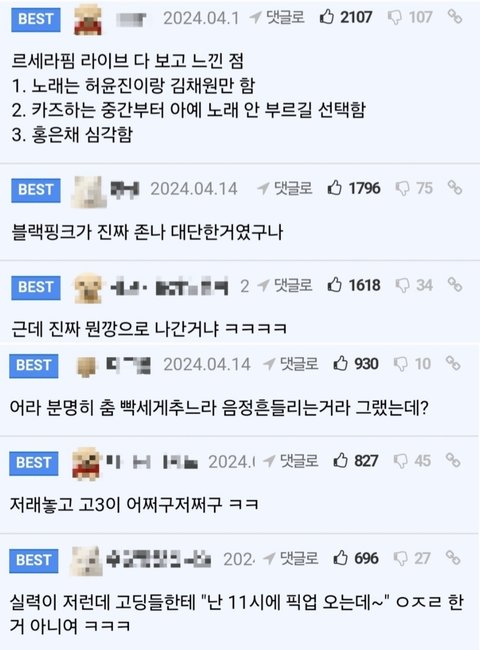 릇저씨들 패턴이 타돌 후려치면서 은근슬쩍 르세라핌 올려치고 저렇게 피코질 하는거임. 특히 걸플갤 여기서 오만 커뮤로 좌표 다 찍으면서 저러고 다님. 근데 르세라핌 코첼라는 뉴스까지 나올 정도로 진짜 말 그대로 대참사라서 작정하고 무대에서 깽판치지 않는 이상 못 넘음 ㅋㅋ