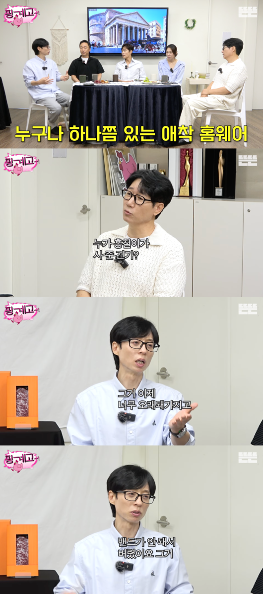 이날 이병헌은 “아무래도 집에서는 아주 편한 옷을 입는다”고 했고, 유재석은 “약간 애착 반바지 그런 것처럼 내가 입었을 때 편안한 옷이 있다”고 했다.
