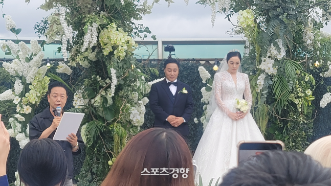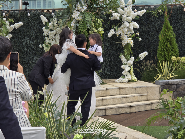 두 자녀를 품에 안고 입장하는 김병만. 사진 독자제공김병만은 아들과 딸을 품에 안고 하객 사이를 지나며 뜨거운 박수를 받았다. 신부 현은재는 화려한 비즈 장식이 더해진 웨딩드레스를 입고 단아한 모습으로 자리를 지켜 눈길을 끌었다.