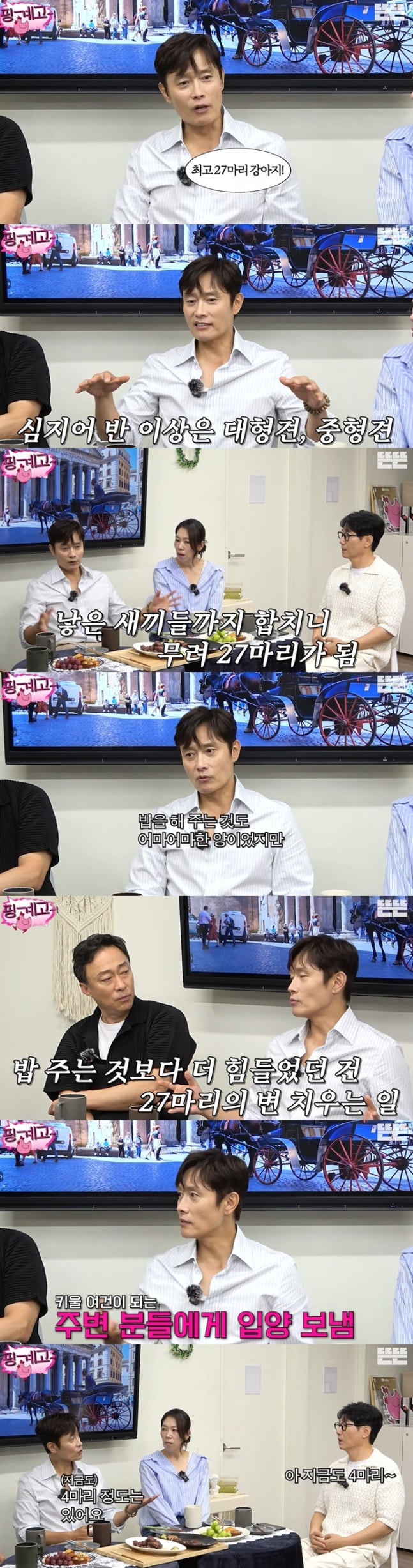 이병헌은 반려견 27마리에 대해 "반 이상은 대형경, 중형견이다. 새끼들까지 합쳐서 27마리였다"며 "밥을 해 주는 것도 어마어마한 양이었지만 밥보다 변을 치우는 게 엄청 힘들었다"고 당시의 고충을 토로했다.