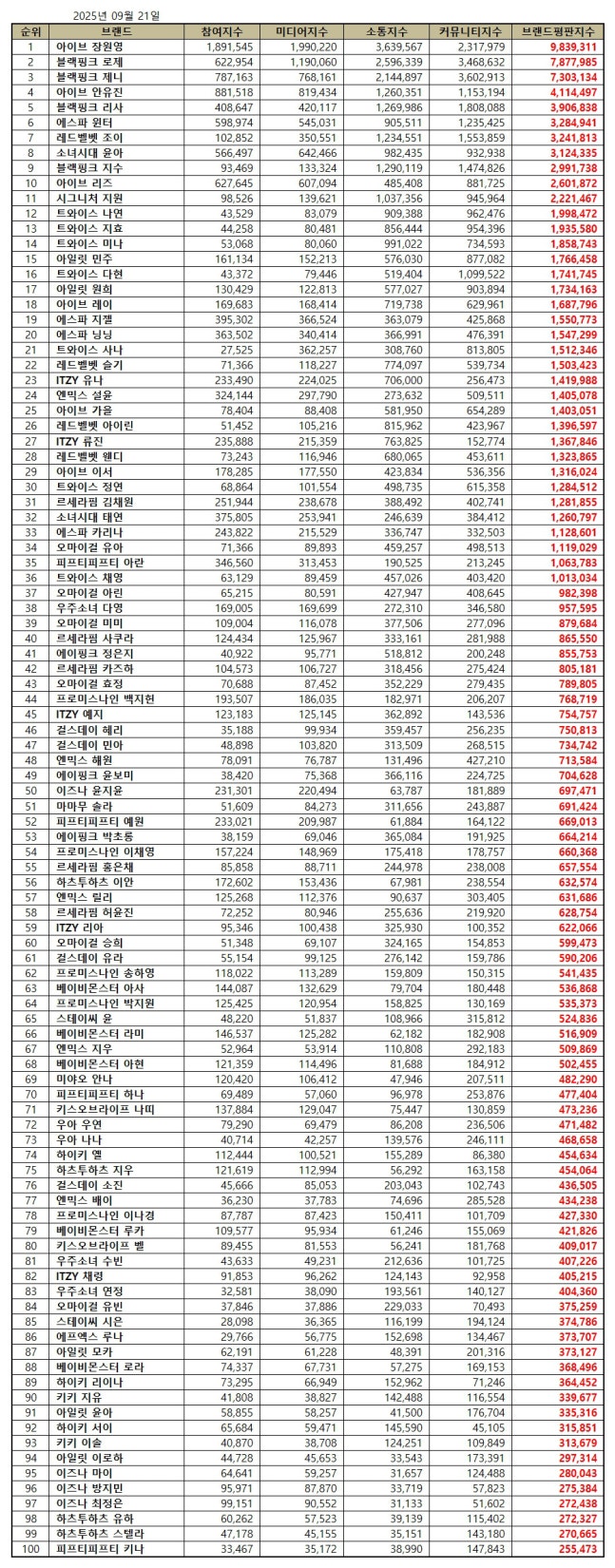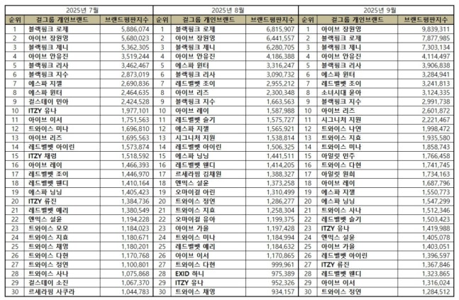2025년 9월 걸그룹 개인 브랜드평판 100위 브랜드는 아이브 장원영, 블랙핑크 로제, 블랙핑크 제니, 아이브 안유진, 블랙핑크 리사, 에스파 윈터, 레드벨벳 조이, 소녀시대 윤아, 블랙핑크 지수, 아이브 리즈, 시그니처 지원, 트와이스 나연, 트와이스 지효, 트와이스 미나, 아일릿 민주, 트와이스 다현, 아일릿 원희, 아이브 레이, 에스파 지젤, 에스파 닝닝, 트와이스 사나, 레드벨벳 슬기, ITZY 유나, 엔믹스 설윤, 아이브 가을, 레드벨벳 아이린, ITZY 류진, 레드벨벳 웬디, 아이브 이서, 트와이스 정연, 르세라핌 김채원, 소녀시대 태연, 에스파 카리나, 오마이걸 유아, 피프티피프티 아란 , 트와이스 채영, 오마이걸 아린, 우주소녀 다영, 오마이걸 미미, 르세라핌 사쿠라, 에이핑크 정은지, 르세라핌 카즈하, 오마이걸 효정, 프로미스나인 백지헌, ITZY 예지, 걸스데이 혜리, 걸스데이 민아, 엔믹스 해원, 에이핑크 윤보미, 이즈나 윤지윤, 마마무 솔라, 피프티피프티 예원, 에이핑크 박초롱, 프로미스나인 이채영, 르세라핌 홍은채, 하츠투하츠 이안, 엔믹스 릴리, 르세라핌 허윤진, ITZY 리아, 오마이걸 승희, 걸스데이 유라, 프로미스나인 송하영, 베이비몬스터 아사, 프로미스나인 박지원, 스테이씨 윤, 베이비몬스터 라미, 엔믹스 지우, 베이비몬스터 아현, 미야오 안나, 피프티피프티 하나, 키스오브라이프 나띠, 우아 우연, 우아 나나, 하이키 옐, 하츠투하츠 지우, 걸스데이 소진, 엔믹스 배이, 프로미스나인 이나경, 베이비몬스터 루카, 키스오브라이프 벨, 우주소녀 수빈, ITZY 채령, 우주소녀 연정, 오마이걸 유빈, 스테이씨 시은, 에프엑스 루나, 아일릿 모카, 베이비몬스터 로라, 하이키 리이나, 키키 지유, 아일릿 윤아, 하이키 서이, 키키 이솔, 아일릿 이로하, 이즈나 마이, 이즈나 방지민, 이즈나 최정은, 하츠투하츠 유하, 하츠투하츠 스텔라, 피프티피프티 키나 순으로 분석됐다.