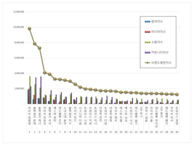 1위 아이브 장원영 2위 블랙핑크 로제 3위 블랙핑크 제니2025년 9월 걸그룹 개인 브랜드평판 30위 순위는 아이브 장원영, 블랙핑크 로제, 블랙핑크 제니, 아이브 안유진, 블랙핑크 리사, 에스파 윈터, 레드벨벳 조이, 소녀시대 윤아, 블랙핑크 지수, 아이브 리즈, 시그니처 지원, 트와이스 나연, 트와이스 지효, 트와이스 미나, 아일릿 민주, 트와이스 다현, 아일릿 원희, 아이브 레이, 에스파 지젤, 에스파 닝닝, 트와이스 사나, 레드벨벳 슬기, ITZY 유나, 엔믹스 설윤, 아이브 가을, 레드벨벳 아이린, ITZY 류진, 레드벨벳 웬디, 아이브 이서, 트와이스 정연 순으로 분석됐다.