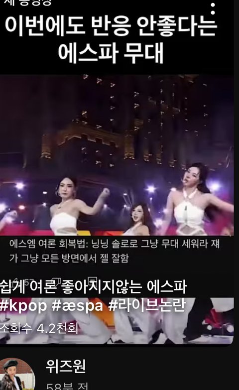 쇼츠로 여론 확인하면 ㅋㅋㅋ 안까인 케이팝 1군돌이 없는뎅... 여론확인을 할거면 유튜브 쇼츠따리로 볼게 아니라 윗댓 말대로 음원이든 광고 현황이든 뭔가 실체를 봐야지 누가 쇼츠 따리로 ㅋㅋㅋㅋㅋㅋ 니네그룹 여론 안돌아오는건 광고도 없고 이제 대중들이 안찾아주면서 커뮤여론까지 안좋으니까 회복 안된다는거고~ 에스파는 이번에도 상받고 1위한거보면 현실 타격은 없어보임 ㅎ
