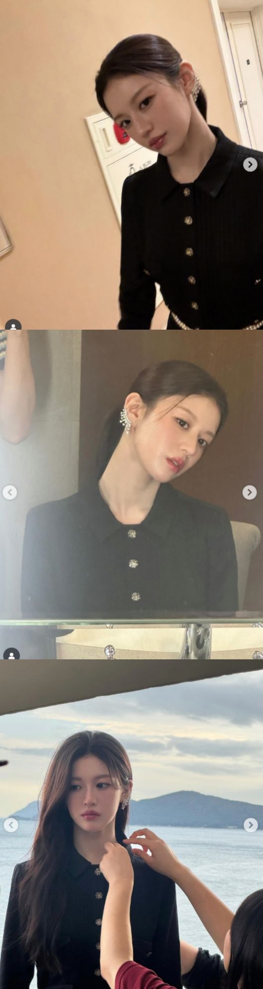 사진 속 고윤정은 단정하게 묶은 헤어스타일에 그빛 장식이 어우러진 블랙 드레스를 입고 포즈를 취하고 있다. 복도를 거닐다 찍힌 그는 흔들리는 초점에도 변함없는 미모를 과시했다.