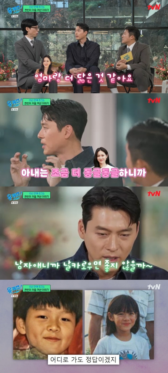 현빈 역시 tvN '유 퀴즈 온 더 블럭'(이하 '유퀴즈')에 출연해 "저랑 와이프는 좀 다른 거 같다. 와이프는 본인을 닮았으면 좋겠다고 하고 저는 절 닮았으면 좋겠다고 한다. 제가 더 선이 날카롭게 생겼고 와이프가 더 동글동글하니까 남자애니까 더 날카로우면 좋지 않을까 해서"라며 같은 발언을 하기도 했다.