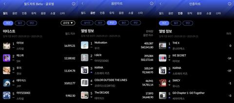 세계 유일의 실시간 음악차트인 한터차트는 22일 오전 10시, 2025년 9월 3주 차 주간차트를 발표했다. 이에 따르면 아이브와 우기, 몬스타엑스가 한터차트 9월 3주 차 월드차트와 음반차트, 인증차트 각 부문 1위를 차지했다.