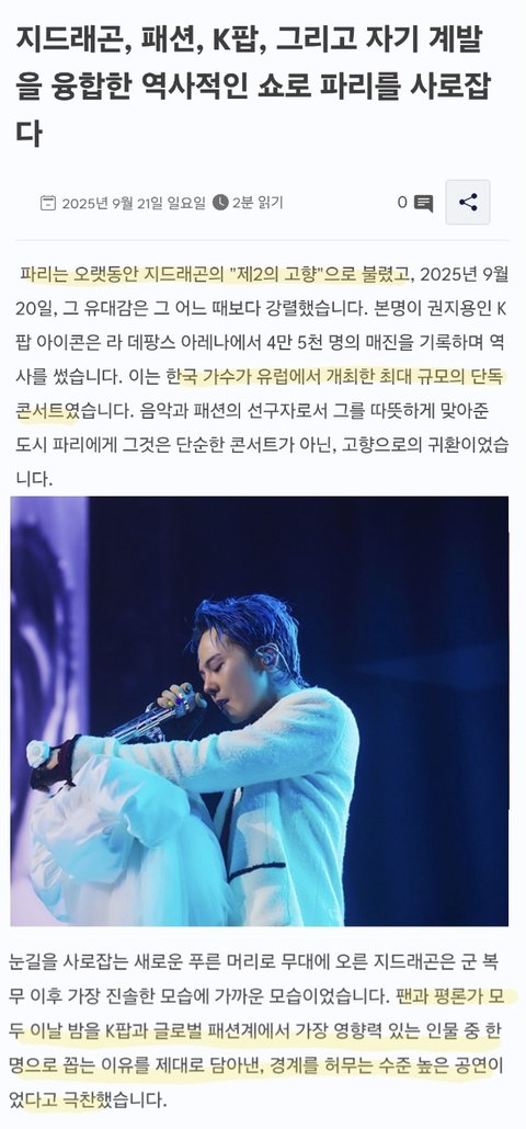 프랑스 파리콘서트에서 K팝 솔로 최다 관객 동원함