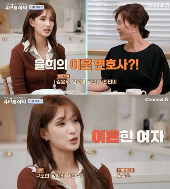 그룹 라붐 출신 방송인 율희가 연애와 이혼에 대한 속내를 전했다.22일 방송된 채널A 교양 프로그램 '절친 토큐멘터리 4인용 식탁'(이하 '4인용 식탁')에는 배우 방은희가 절친으로 율희, 양소영 변호사를 집으로 초대해 함께 식사하는 장면이 예고됐다.