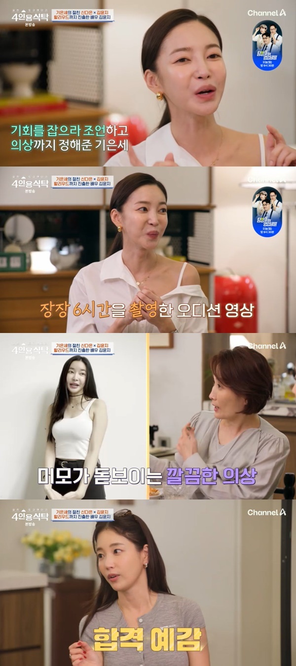기은세는 “미국 영화에 많이 나오는 이미지가 있다. 영상을 보니 될 것 같았다”고 말했고, 김윤지는 “언니가 될 것 같으니까 되면 밥 사라고 했다”며 “2명 남았다고 했을 때 항상 그런 상황에서 안 됐다. 왜 나를 쓰겠냐고 했다. 되니까 나도 되네? 너무 신기해서 눈물이 안 나더라. 엉엉 울 줄 알았다. 혼자 비행기를 타고 스튜어디스가 와서 무슨 일이 있냐고 할 정도로 엉엉 울었다”고도 털어놨다. (사진=채널A ‘절친 토큐멘터리 4인용식탁’ 캡처)