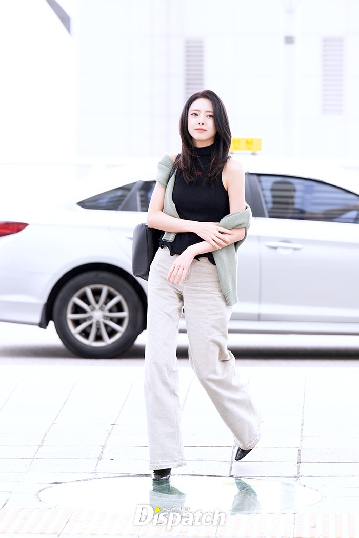 유나는 데님 팬츠에 민소매 셔츠로 우아한 공항패션을 연출했다. 인형같은 미모가 돋보였다.