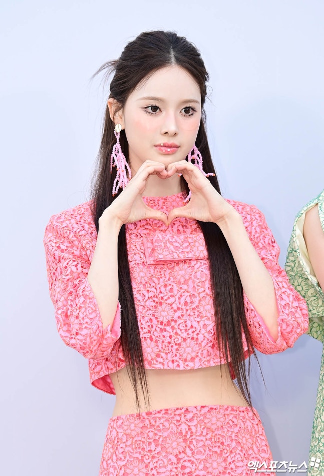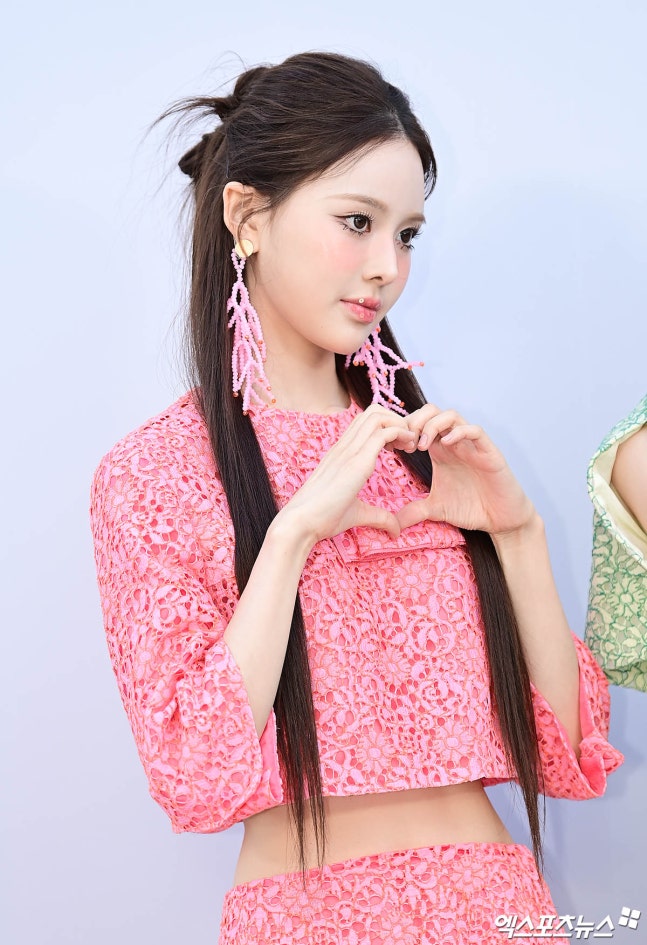 방지민은 레이스 소재의 핑크색 크롭 기장의 상의와 머메이드 라인 스커트를 매치해 특유의 사랑스러운 매력을 뽐냈다. 한 줌 사이즈의 잘록한 허리 라인이 돋보인 가운데 선명한 일자 복근로 현실감 없는 몸매를 과시했다.