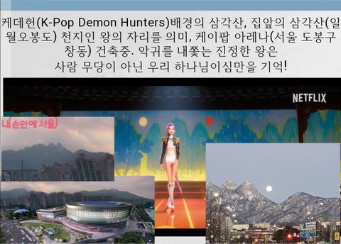 케데헌(K-Pop Demon Hunters)의 Golden 배경 삼각산 그림(일월오봉도 Golden background by K-Pop Demon Hunters Samgaksan painting (Ilwol Obongdo) )과 우리 집앞 진짜 삼각산, 다음은 삼각산 아래 지어지는 서울 도봉구 창동 k팝 아레나 공연장 - 일월오봉도: 천지인을 상징하고 왕의 보좌의 배경이 되며 하늘과 땅과 왕을 의미, 진정한 구원자요 마귀를 내쫓는 우주의 왕은 인간과 연애인, 무당이 아닌 하나님을 항상 기억하고 열광해야 할것입니다 아멘! 할렐루야!(#활공교회)