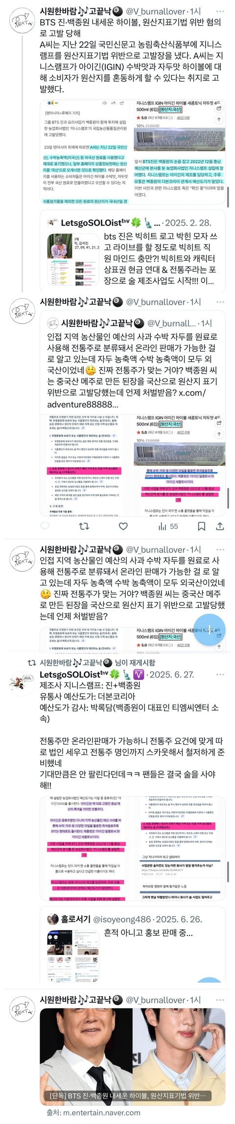 정리해줄게ㅡ제품에 아무 이상 없고 쌀 배 사과 다 국내산 사용한 거 맞고 스토어 본문, 제품에도 살짝 맛을 내기 위해 첨가한 외국산 과일은 정상적으로 표기되어 있음 사실 제목을 주재료인 쌀 배 사과를 생각하고 국내산이라고 썼을 수도 있는 관리자가 판단 미스한 거라고 봄 일부러 속이려고 한 게 아니라는 거임 어쨌든 관리자가 실수한 걸로 크게 부풀려서 빌드업하는 악개들이 항상 문제임 게다가 진은 대표도 아니고 스토어 관리자도 아님니다. 잘못이 없어요 다 진 욕은 안하더라 그럴 사람도 아니고