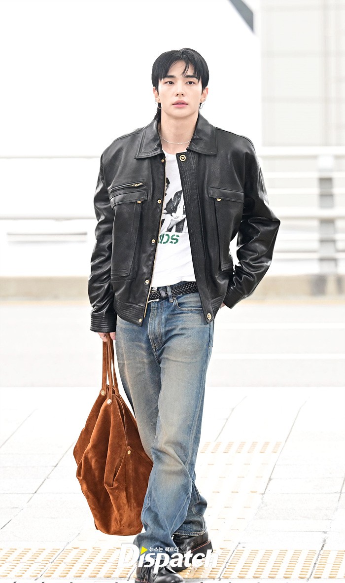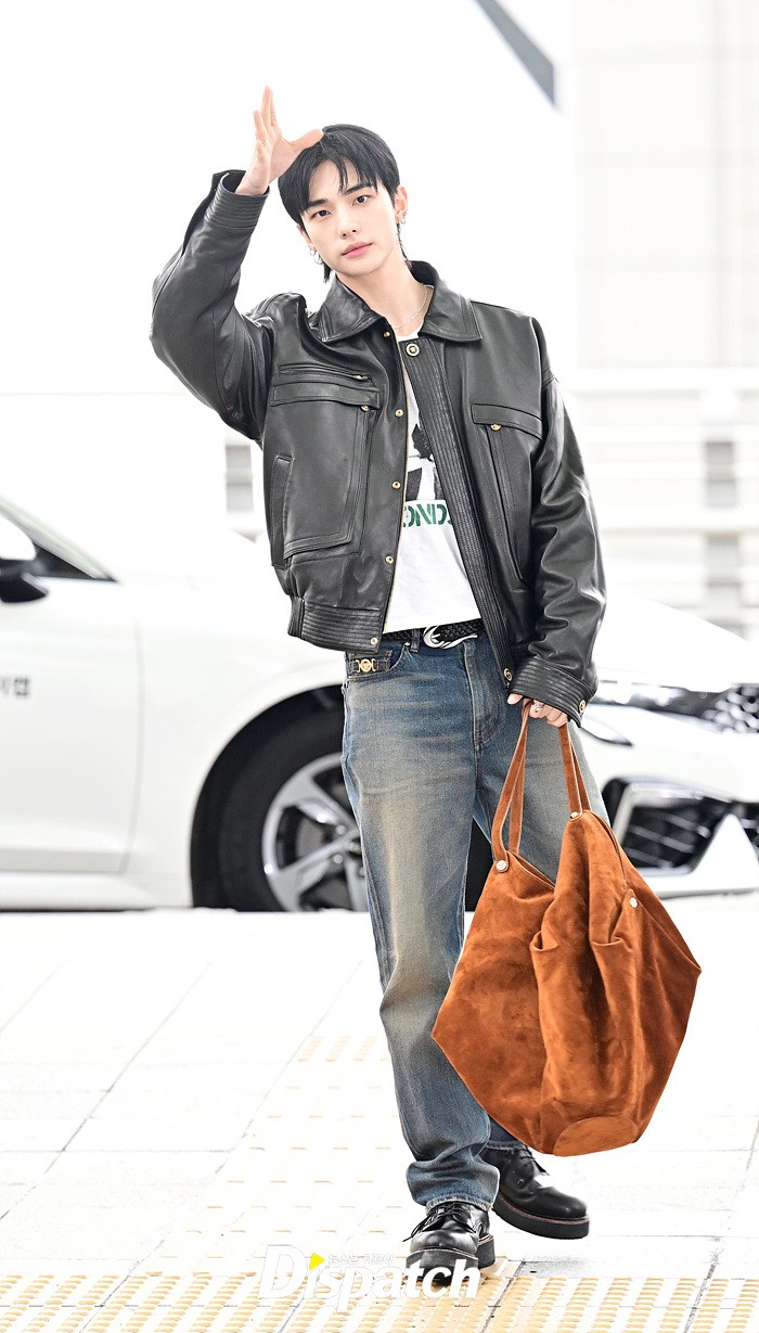 현진은 가죽 재킷과 데님진으로 댄디한 공항패션을 완성했다. 조각같은 비주얼과 스윗한 인사도 인상적이였다.