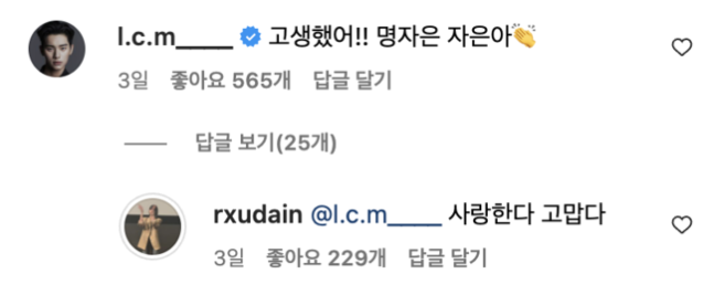 드라마 종영 후 올린 류다인의 게시물에 이채민은 “고생했어!! 명자은 자은아”라고 댓글을 남겼고, 이에 류다인은 “사랑한다 고맙다”라고 답글을 달았다. 큰 멘트는 없었지만 “고생했어”, “사랑한다”로 전해진 애정을 느낄 수 있었다.