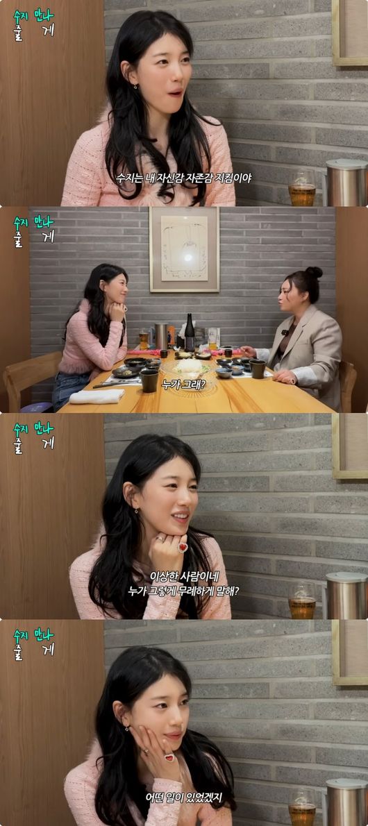 그러면서 조현아는 수지에게 “너는 내 자신감, 자존감 지킴이다. 완전 지킴”라며, “내가 너한테 가서 ‘누가 이렇대’ 하면 ‘언니! 그 사람 이상하네. 왜 그런 말을 해’라고 한다. 나는 어디서 막 상처를 받고 온다, 내가 ‘누가 그렇대’ 그러면 수지가 ‘언니 누가 그렇게 무례하게 말해? 이상한 사람이네’라고 한다”라고 언급했다.