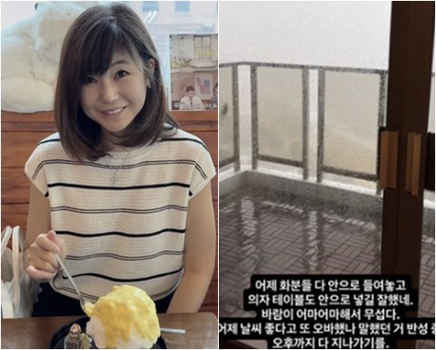 강수정은 "어제 화분들 다 안으로 들여 놓고 의자 테이블도 안으로 넣길 잘했네"라면서  "바람이 어마어마해서 무섭다"고 했다.