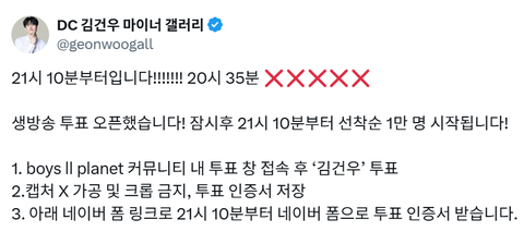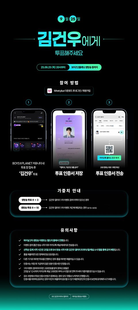 ★★★투표시간★★★ 선착순 9시 10분부터로 바뀜!! ★★★투표방법★★★ ① 카톡플친 '김건우 갤러리 이벤트' 추가 ② 엠넷플러스 앱 설치 ③ 오늘(목) 방송 시작 후(8시~) 이벤트 참여 폼이 카톡플친으로 전송됨 ④ 엠넷플러스 앱에서 '김건우' 투표하고 발급된 인증서를 ★8시 35분(확정됨)★에 폼으로 제출