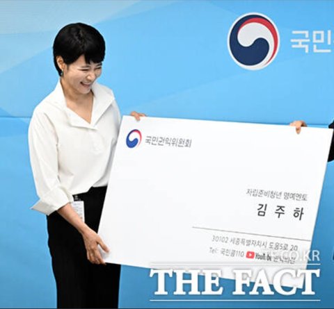[퍼온 글] 대형 명함 보며 활짝 웃는 김주하 명예멘토 <포토> - 더팩트 임영무 기자 (2025.09.24(수) 오전 11:37)
