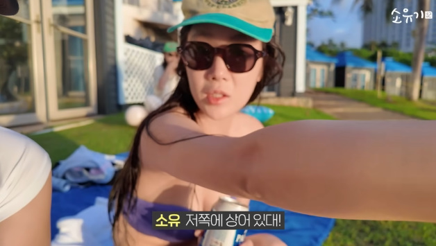 물놀이를 마치고 해변가에 앉아 노을을 바라본 소유는 "아까 바다에서 놀면서 느낀 점은 이 바다를 전세낸 느낌. 그리고 뻥 아니고 저쪽에 상어있대. 난 못 봤다. 무서웠다. 절벽쪽에 있다더라. 그래서 아까 패들보드 타고 저쪽으로 가시더라"라며 "그리고 여기 안에 쓰레기들이 엄청 많더라. 와인병이랑 몇개 주워왔다. 바다를 사랑하는 사람으로서 쓰레기를 가만히 둘수 없다"라고 전했다.