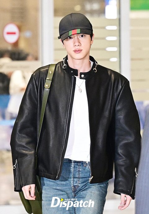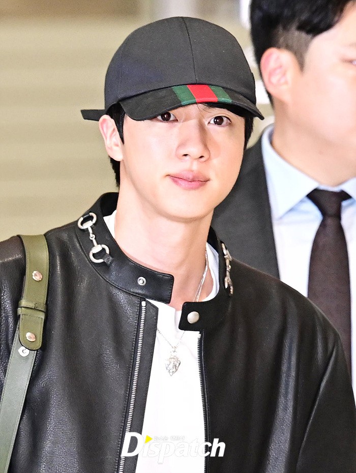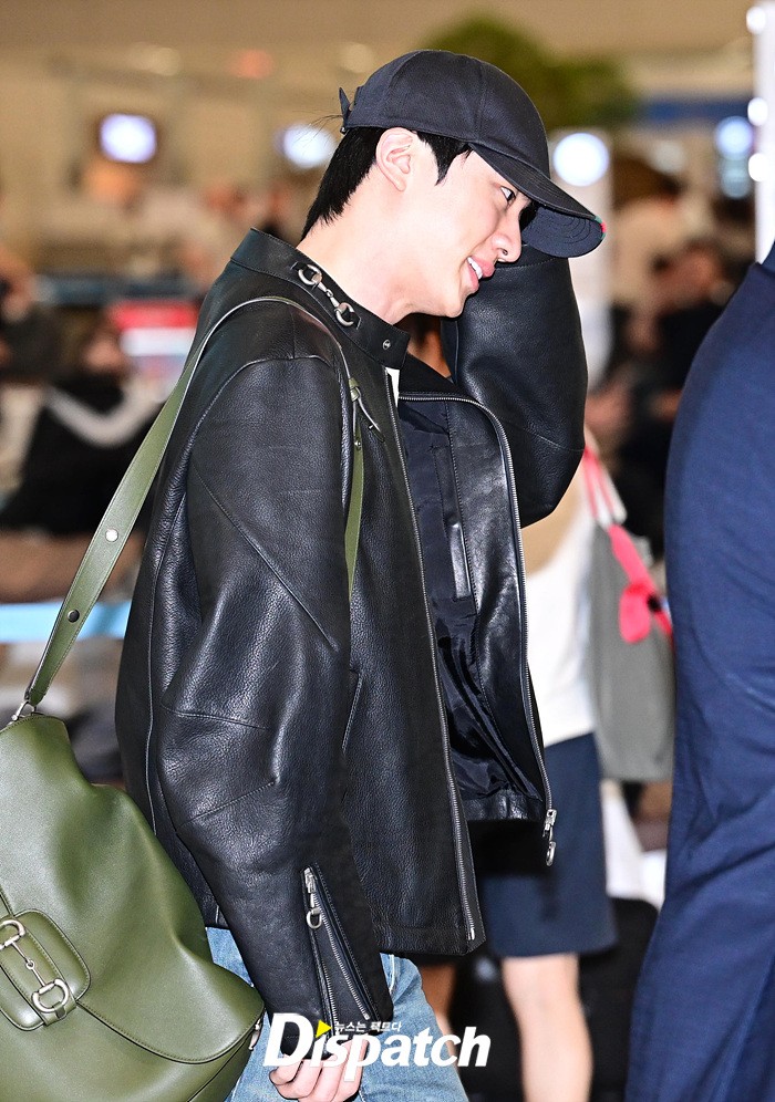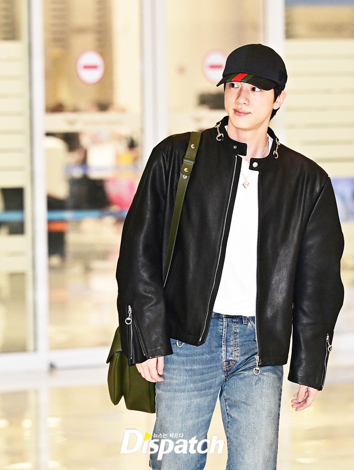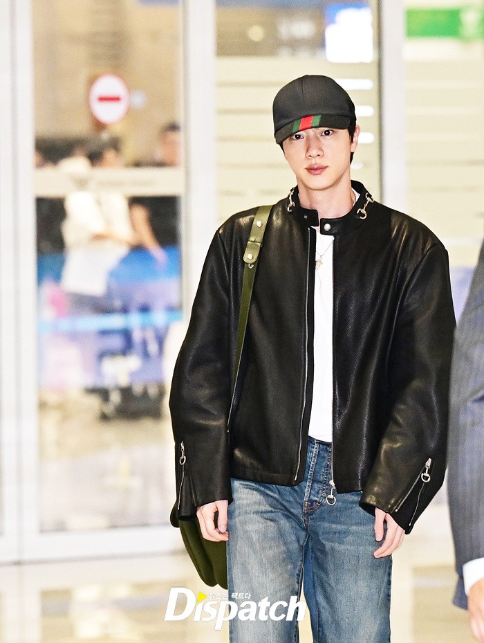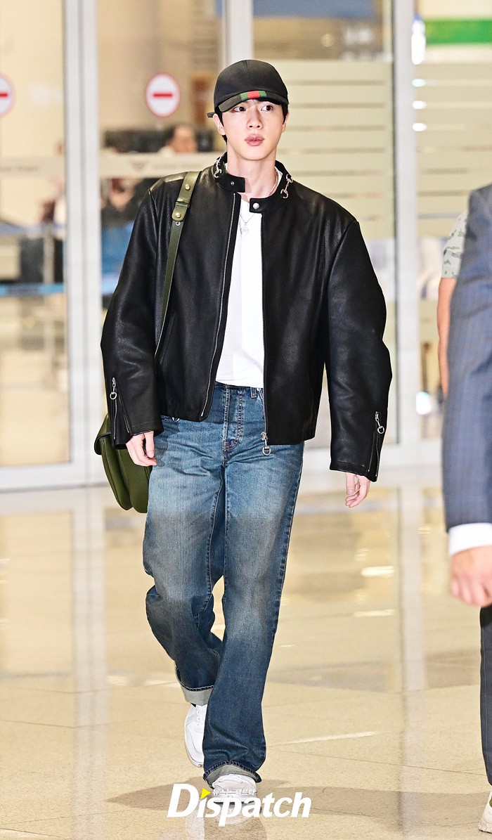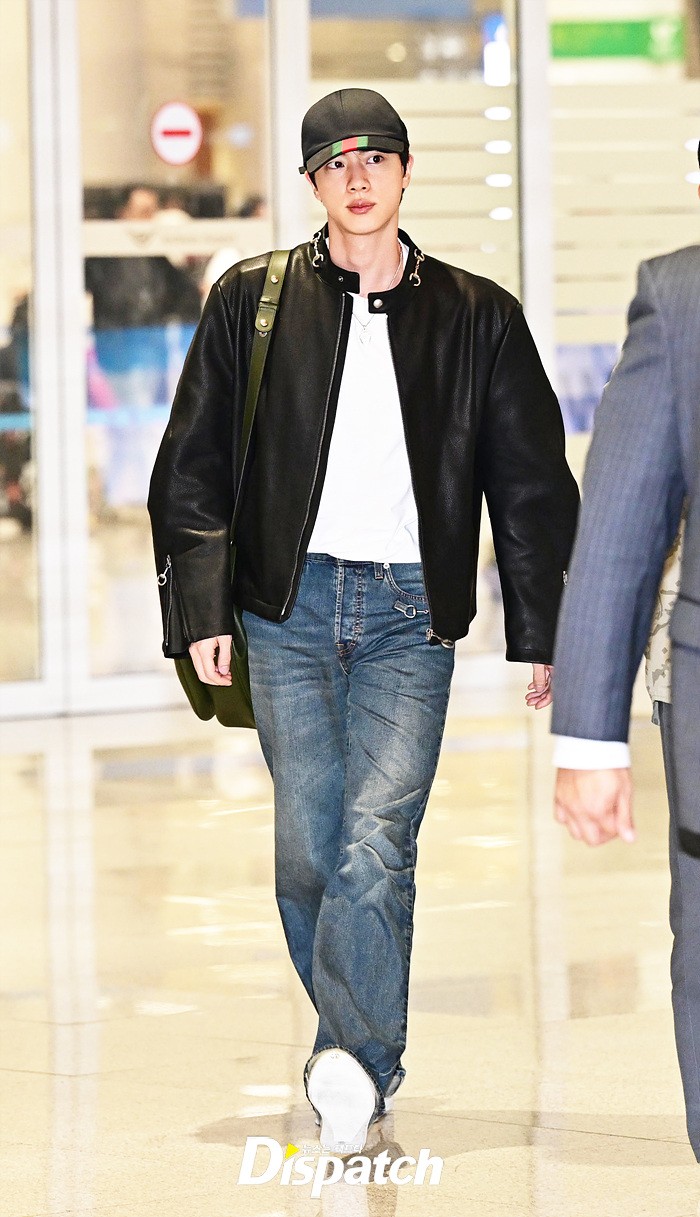 진은 가죽 재킷과 데님진으로 댄디한 공항패션을 완성했다. 장시간 비행에도 훈훈한 비주얼이 돋보였다.