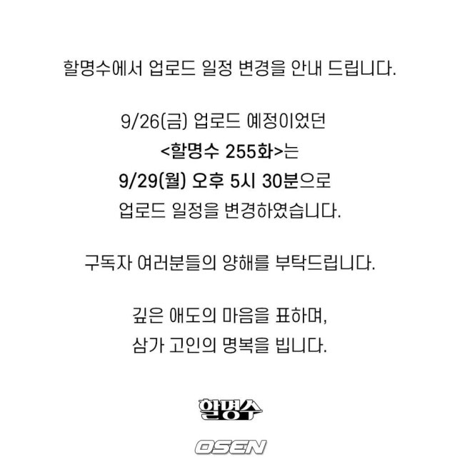 당초 이날 업로드 예정이었던 '할명수' 255화는 오는 29일 오후 5시 30분으로 공개가 연기된다. 이는 이날 故 전유성의 부고가 전해짐에 따라 추모의 뜻을 전하기 위한 것.