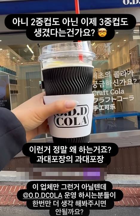 하지만 그는 "저는 일회용 컵 자체도 문제라고 보고 있는 사람 중 하나"라면서 "아마 여러분도 5%밖에 재활용이 안 된다는 사실을 들으면 제 생각에 조금 더 공감하시지 않을까 한다"고 설명했다. 이어 "그러나 이중 컵을 위해 홀더 외에 있는 '3중 컵' 영상을 보니, 사실대로 말씀드리자면 충격을 크게 받았다. 그걸 보고 앞뒤 가리지 못하고 스토리를 올렸다"고 했다.