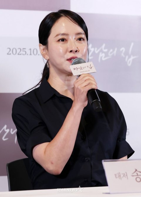 배우 송지효가 26일 서울 용산구 CGV 용산아이파크몰에서 진행된 영화 '만남의 집(차정윤 감독)' 언론시사회 및 기자간담호에 참석해 질의응답을 하고 있다. /2025.09.26 /사진=김휘선 hwijpg@
