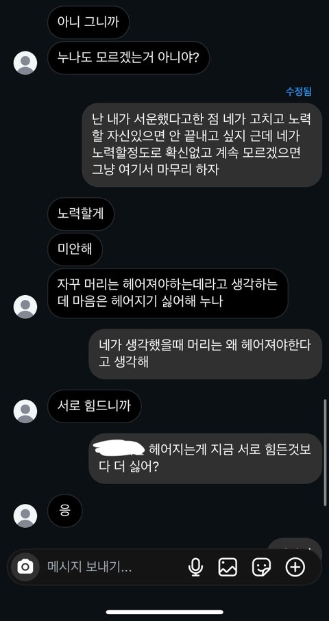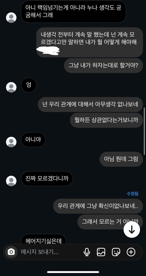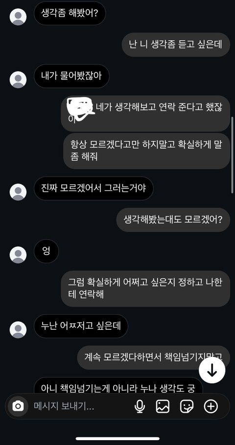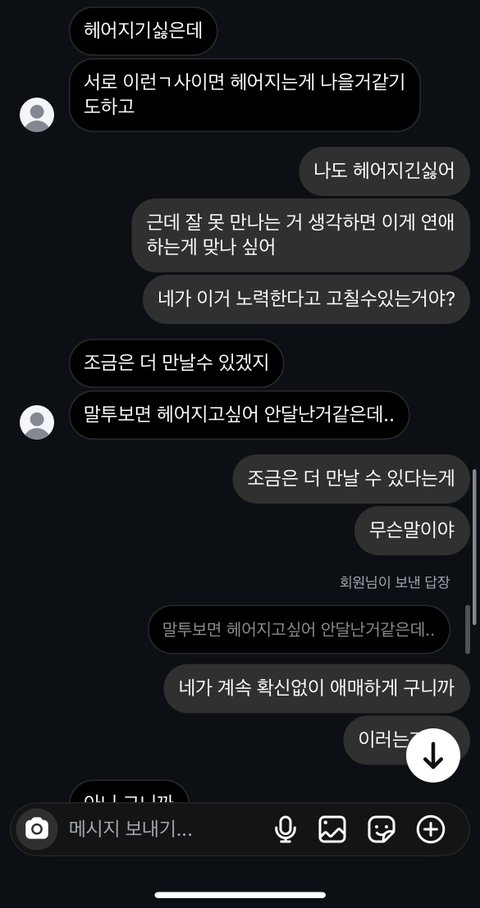 밤 10시쯤에 저런식으로 디엠 왔는데 쟤는 왜 저렇게 애매하게 구는걸까 연락하는내내 너무 화가났어 둘 다 너무 답답해 ..