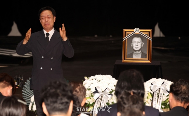 그러면서 "영결식 때는 김정렬 선배님이 오셔서 선생님이 좋아하셨던 '숭구리당당' 춤을 보여줬는데, 선배님의 마지막 길이 엄숙하게 진행되는 걸 별로 안 좋아하실 거 같아서 선배님께 너무 감사했다고 큰 박수 한번 드리는 시간을 갖겠다. 좀 더 유쾌했으면 좋겠다"고 했고, "선배님 안녕히 가세요"라는 말과 함께 큰 박수 소리가 이어졌다.