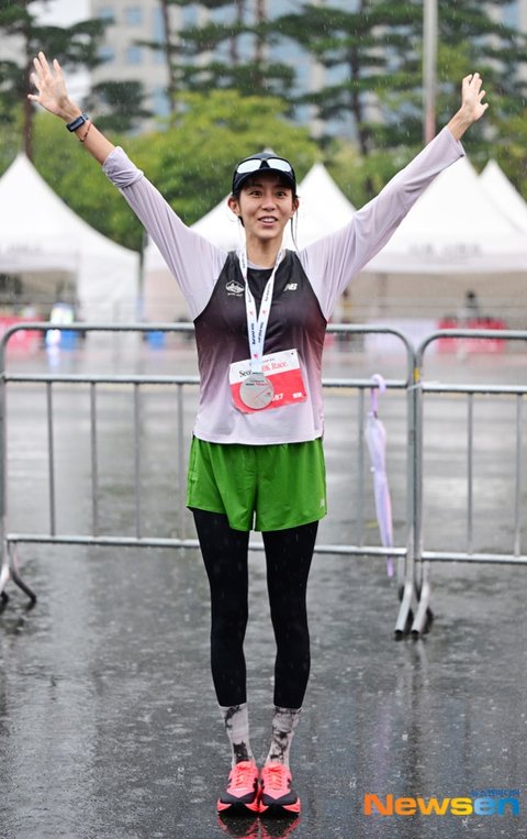 이날 유이가 10km 완주 후 포즈를 취하고 있다.