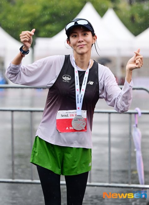이날 유이가 10km 완주 후 포즈를 취하고 있다.