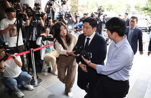 방시혁 하이브 의장이 15일 서울 마포구 서울경찰청 금융범죄수사대에 피의자 신분으로 출석하고 있다. 연합뉴스