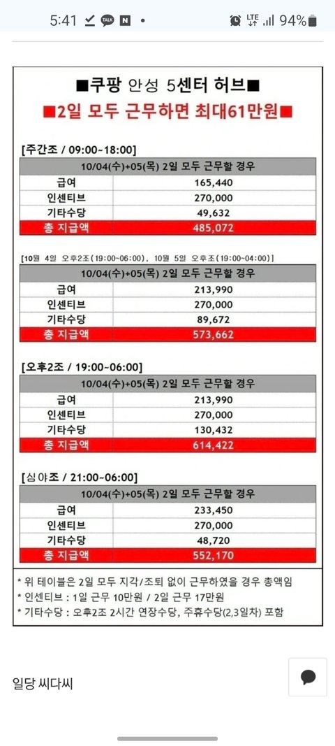 지금 쿠팡 일당 2일 일하고 61만원줌...