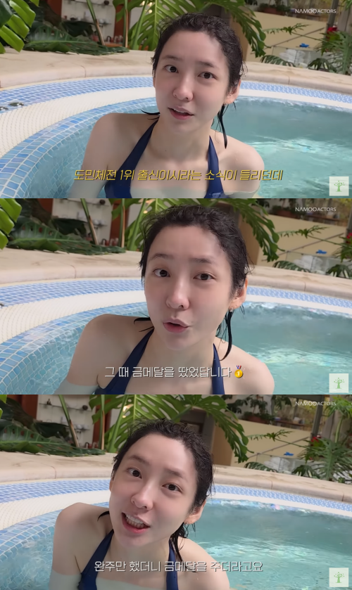 유튜브 채널 '나무엑터스' 캡처.제작진이 "도민체전 1위 출신이던데"라고 언급하자 박지현은 "맞다. 초등학교 때 배영 장거리 대회에 나갔는데 그때 금메달 땄다"고 전했다.