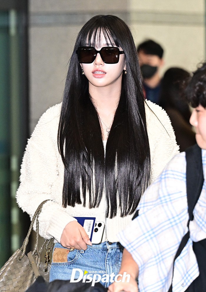 수인은 화이트 컬러의 니트와 데님진으로 캐주얼한 공항패션을 연출했다. 장시간 비행에도 눈부신 미모가 돋보였다.