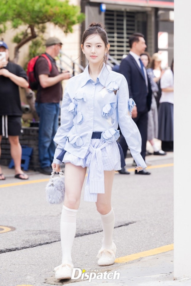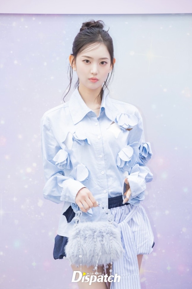 이솔은 블루 셔츠와 벌룬 스커트로 상큼한 매력을 뽐냈다. 인형같은 미모가 돋보였다.