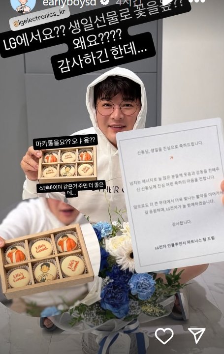 신동은 “LG에서요? 생일선물로 꽃을요?? 왜요?? 감사하긴 한데... 마카롱을요? 스탠바이미 같은 거 주면 더 좋은데"라는 메시지로 너스레를 떨었다. 커스텀 케이크 인증샷에 대해서는 "40살 생일이라고 했더니. 얼굴을 너무 늙게 만든 거 아니닝? 그냥 지금 내 얼굴로 만들어"라고 버럭해 웃음을 자아냈다.